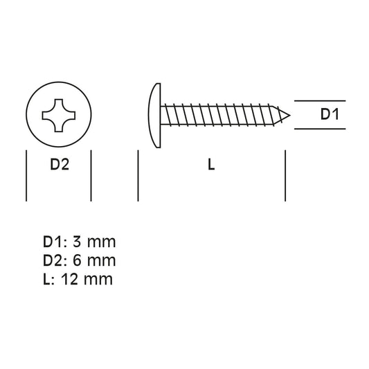 Rivet style screw. Nickel finish. Phillips head. M3 x 12