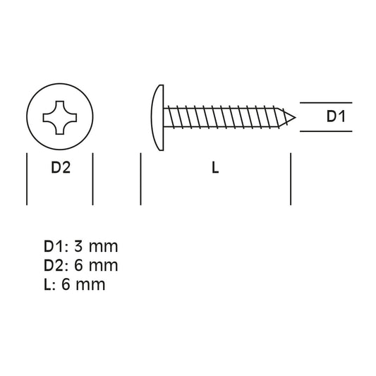 Rivet style screw. Nickel finish. Phillips head. M3 x 6